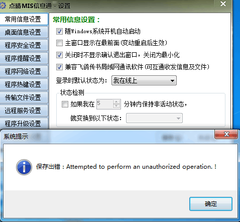 設置點晴MIS信息通保存時報錯:Attempted to perform an unauthorized operation,如何解決?
