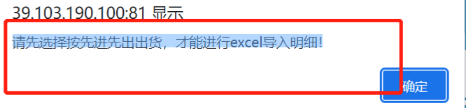 :點(diǎn)晴ERP-其他出庫批量出庫操作說明![]() 點(diǎn)擊進(jìn)入 如下圖: 下載模板 操作如下圖: 按照模板初始填寫的內(nèi)容,參考填寫即可。 若彈出提示:請(qǐng)先選擇按先進(jìn)先出出貨,才能進(jìn)行excel導(dǎo)入明細(xì)! 如下圖: ![]() 需要先開啟先進(jìn)先出原則,教程鏈接:http://20705.oa22.cn