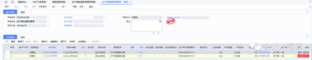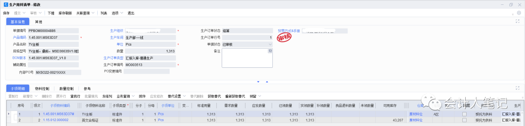 以1.45.001.MS63D37主板的制造為例:假設此款主板的BOM是“1.45.001.MS63D37M主板+1.15.012.000002英文合格證1PCS”。如果我們要生產1313片不帶M的主板,那么根據BOM,我們需要1313片帶M的主板和1313片英文合格證。這是BOM的靜態需求。然而,在實際生產過程中,可能會出現一些變動。比如,這個英文合格證實際上是ML投料,HM是沒有庫存的,PMC投料錯誤,就要做生產用料清單變更單。
