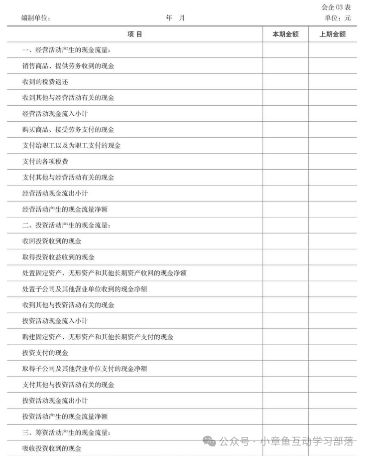常見的利潤表結構主要有單步式和多步式兩種。在我國,企業利潤表采用的基本上是多步式結構,即通過對當期的收入、費用、支出項目按性質加以歸類,按利潤形成的主要環節列示一些中間性利潤指標,分步計算當期損益。利潤表主要反映以下幾方面的內容: (1)營業收入=主營業務收入+其他業務收入; (2)營業利潤=營業收入-營業成本(主營業務成本和其他業務成本)-稅金及附加-銷售費用-管理費用-研發費用-財務費用-資產減值損失-信用減值損失+其他收益+投資收益+公允價值變動收益+資產處置收益; (3)利潤總額=營業利潤+營業外收入-營業外支出; (4)凈利潤=利潤總額-所得稅費用; (5)每股收益,普通股或潛在普通股已公開交易的企業,以及正處于公開發行普通股或潛在普通股過程中的企業,還應當在利潤表中列示每股收益信息,包括基本每股收益和稀釋每股收益兩項指標。 此外,為了使報表使用者通過比較不同期間利潤的實現情況,判斷企業經營成果的未來發展趨勢,企業需要提供比較利潤表,利潤表還需就各項目再分為“本期金額”和“上期金額”兩欄分別填列。 三.現金流量表 現金流量表,是指企業以現金和現金等價物流入和流出反映企業在一定會計期間內的經營、投資和融資活動的會計報表,是以現金為基礎編制的財務狀況變動表。