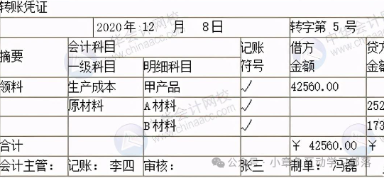 ①收款憑證填制要求: · 收款憑證左上角的“借方科目”按收款的性質(zhì)填寫“庫存現(xiàn)金”或“銀行存款”。 · 日期填寫的是填制本憑證的日期。 · 右上角填寫填制收款憑證的順序號。 · “摘要”填寫對所記錄的經(jīng)濟業(yè)務(wù)的簡要說明。 · “貸方科目”填寫與收入“庫存現(xiàn)金”或“銀行存款”相對應(yīng)的會計科目。 · “記賬”是指該憑證已登記賬簿的標記,防止經(jīng)濟業(yè)務(wù)重記或漏記。 · “金額”是指該項經(jīng)濟業(yè)務(wù)的發(fā)生額。 · 該憑證右邊“附件×張”是指本記賬憑證所附原始憑證的張數(shù)。 · 最下邊分別由有關(guān)人員簽章,以明確經(jīng)濟責(zé)任。 ②付款憑證填制要求: 付款憑證是根據(jù)審核無誤的有關(guān)庫存現(xiàn)金和銀行存款的付款業(yè)務(wù)的原始憑證填制的。付款憑證的填證基本相同,不同的制方法與收款憑證在付款憑證的左上角應(yīng)填列貸方科目,即“庫存現(xiàn)金”或“銀行存款”科目。 ③轉(zhuǎn)賬憑證填制要求: 轉(zhuǎn)賬憑證通常是根據(jù)有關(guān)轉(zhuǎn)賬業(yè)務(wù)的原始憑證填制的。轉(zhuǎn)賬憑證中“總賬科目”和“明細科目”欄應(yīng)填寫應(yīng)借、應(yīng)貸的總賬科目和明細科目,借方科目應(yīng)記金額應(yīng)在同一行的“借方金額”欄填列,貸方科目應(yīng)記金額應(yīng)在同一行的“貸方金額”欄填列,“借方金額”欄合計數(shù)與“貸方金額”欄合計數(shù)應(yīng)相等。 【例】2020年12月8日,車間生產(chǎn)甲產(chǎn)品領(lǐng)用A材料350公斤,單價72元,領(lǐng)用B材料560公斤,單價31元。 借:生產(chǎn)成本——甲產(chǎn)品 42 560 貸:原材料——A材料 25 200 ——B材料 17 360