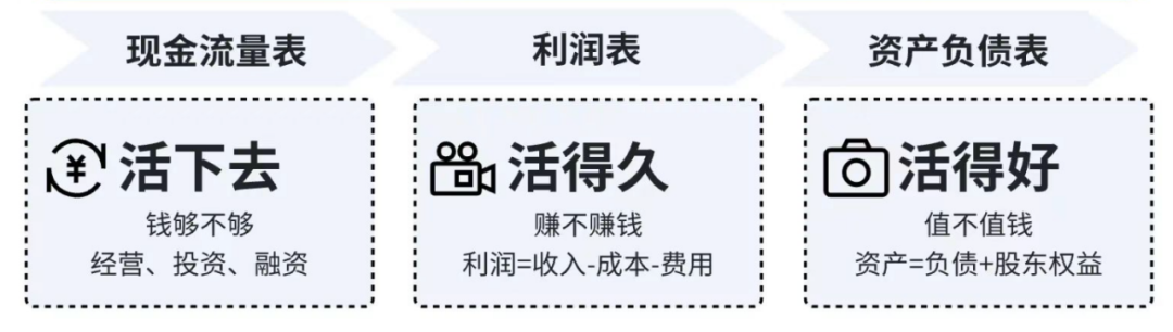 大家都知道財務三大表:資產負債表、利潤表、現金流量表: 錢有不有、夠不夠,看現金流量表,它是企業生存的底線,關系企業是否能活下去; 賺不賺錢,看利潤表,決定企業能否長久活下去; 而值不值錢,企業是不是有真金實貨,得看資產負債表,它將告訴人們企業活得好不好。