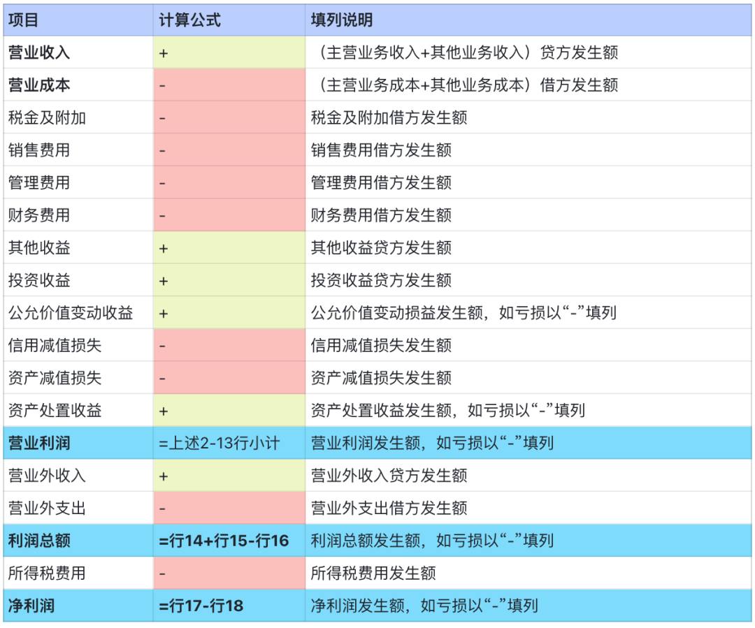 02 利潤表編制原理及填列 2.1 利潤表的編制原理 利潤表中一般應單獨列報的項目主要有營業利潤、利潤總額、凈利潤等。其中,營業利潤單獨列報的項目包括營業收入、營業成本、稅金及附加、銷售費用、管理費用、研發費用、財務費用、信用減值損失、資產減值損失、其他收益、投資收益等;利潤總額項目為營業利潤加上營業外收入減去營業外支出;凈利潤項目為利潤總額減去所得稅費用,包括持續經營凈利潤和終止經營凈利潤等項目; 利潤表各項目需填列“本期金額”和"上期金額”兩欄。其中”上期金額”欄內各項數字,應根據上期利潤表的"本期金額”欄內所列數字填列。 2.2 利潤表的填列方法 利潤表的“本期金額"欄的填列方法,一般應根據損益類科目和所有者權益類有關科目的發生額填列。