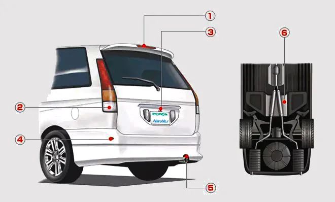 ① 車用閃光燈:防水、提高遮光性 ② 引擎蓋隔壁:隔熱、防噪音 ③ 引擎封條/電池封條:吸收震動、防止物體碰撞噪音 ④ 汽車前燈:防水、提高遮光性 ⑤ 霧燈:防水、提高遮光性 ⑥ 邊角感應器&邊角照相機:防塵、防水 汽車背部周邊模切產品的應用 除了駕駛前之外,汽車的背部設計也非常重要。各種車燈,照明燈,感應器,照相機等耐水性,耐侯性的要求很嚴格。