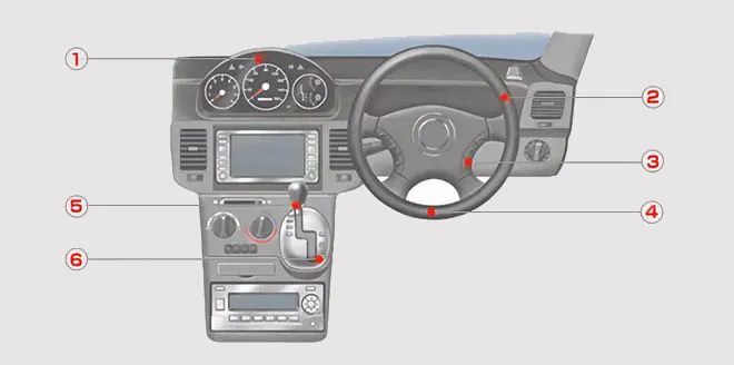 ① 第三煞車燈:防水、提高遮光性 ② 停車燈/倒車燈/閃光燈:防水、提高遮光性 ③ 倒車裝置照相機:防塵、防水 ④ 邊角感應器:防塵、防水 ⑤ 排氣管周圍:遮熱、隔熱 ⑥ 汽油箱絕緣體:遮熱、吸收震動 儀表盤周圍模切產品的應用 向司機傳送重要情報的機器集中在儀表盤周圍。在速度儀表器·各種顯示燈處,模切產品被作為密封材,防塵材遮光材所選用。