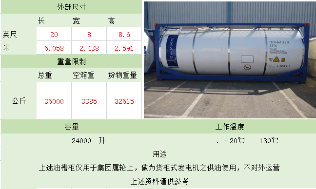 照片名稱:20'ISO TANK(罐式集裝箱) 備注:這種集裝箱是專為裝運液體貨物,如酒類、汽油、化學品而設計的