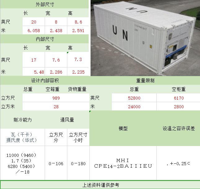 照片名稱:20'Refrigerated(冷凍柜) 備注:專為運輸如魚、肉、新鮮水果、蔬菜等食品而特殊設計的