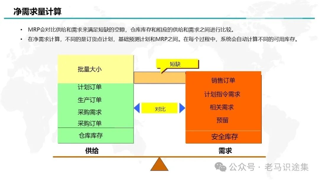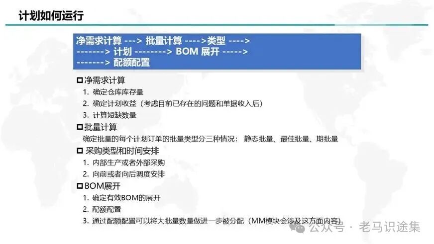 溫過而知新,本次學習過程中,將掌握了一個新的知識點:需求與供給Pegging Relationships,可以追溯需求的來源。MRP運算還真是個挺復雜的計算過程,應該是ERP里最最復雜的計算過程之一,主要分為5個步驟,分別是:1凈需求計算->2批量計算->3獲取采購類型->4時間排程->5BOM展開。詳細內容如下: