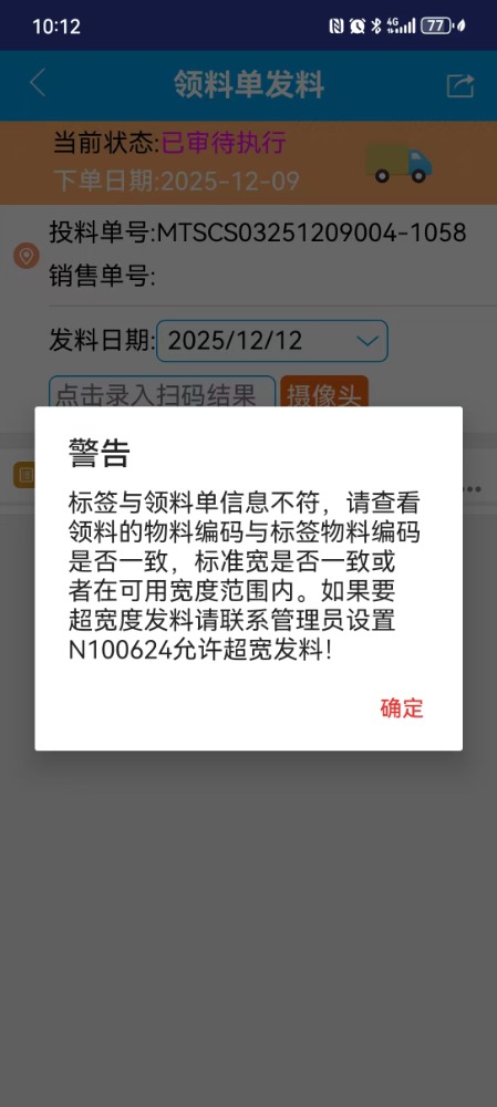 :掃碼領(lǐng)料單標簽發(fā)料時彈出“標簽與領(lǐng)料單信息不符,請查看領(lǐng)料的物料編碼與標簽物料編碼是否一致,標準寬是否一致或者在可用寬度范圍內(nèi)。”