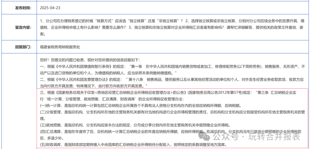 (1)分公司不同于子公司。子公司注銷后,一般情況下,母公司承擔有限責任;分公司注銷后,總公司則無法規(guī)避分公司的債務。 (2)法律層面,總公司對分公司的債務,承擔共同責任。 (3)財務層面,分公司既沒有實收資本,也沒有資本公積,也不計提盈余公積,所有者權(quán)益只有未分配利潤,不存在所有者權(quán)益的抵消。 (4)分公司注銷后,總公司將分公司的資產(chǎn)、負債、年初未分配利潤、當期利潤,通過分錄的形式調(diào)整到總公司。(處置類似于子公司的處置的邏輯) 那么總、分公司有哪些合并抵銷呢? 內(nèi)部交易例題:2023年12月31日,總公司將賬面金額為800萬元的存貨,以1,000萬元的價格出售給分公司。(或分公司出售給總公司) 1、2023年12月31日合并的調(diào)整分錄,收入、成本、存貨的抵消: 借:主營業(yè)務收入 1,000 貸:主營業(yè)務成本 800 貸:存貨 200 2、2024年出售50% (1)以前年度調(diào)整 借:年初未分配利潤 200 貸:存貨 200 (2)分公司單體確認成本500,然而站在總公司合并的基礎(chǔ)上賬面只有400,因此需要沖掉100,總公司合并抵銷如下: 借:存貨 100 貸:主營業(yè)務成本 100 注:這里沒有考慮遞延所得稅,所得稅一般由總公司匯總計算,不存在稅會差異。 以下為福建稅務總局關(guān)于總分公司所得稅問題的答復,簡而言之就是:統(tǒng)一計算、統(tǒng)一申報。 https://fujian.chinatax.gov.cn/fzsswj/gzcy/nszx/detail.htm?id=93678