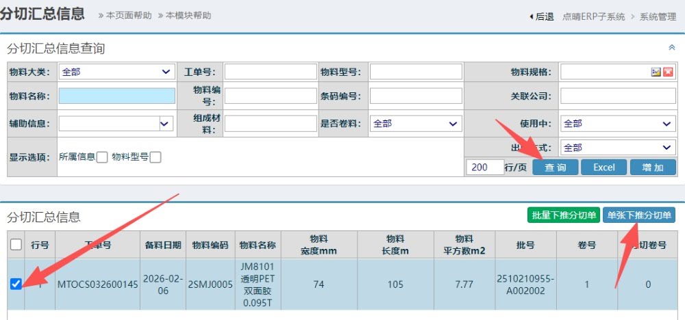 進入界面后,選中需要下推形成的分切明細,點擊“單張下推分切單”按鈕