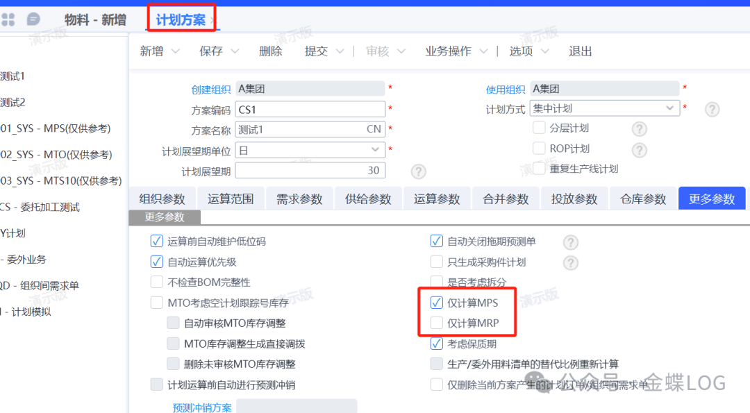 如果要限制此方案只跑MPS或MRP的物料,可以在計劃方案的【更多參數(shù)】里面勾選【僅計算MPS】或【僅計算MRP】。
