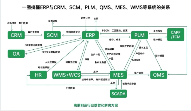 但現(xiàn)在市面上的很多“ERP軟件”,其實(shí)只是個(gè)打著名號的工具,功能缺漏、邏輯混亂,有的甚至連最基本的數(shù)據(jù)都捋不順,更別提實(shí)現(xiàn)資源協(xié)同了。 所以我們說,ERP這個(gè)理念不過時(shí)。過時(shí)的,是那些把ERP當(dāng)成賣報(bào)表、套流程的模板工程,做不到深入企業(yè)實(shí)際,只停留在表面操作的“偽ERP”。 二、ERP和其他管理系統(tǒng)的關(guān)系在管理軟件類別上,除了ERP,還有CRM、PLM、OA、WMS、MES、OMS等等,它們之間又是什么關(guān)系呢? 其實(shí)ERP是“管全局”的系統(tǒng),而MES(生產(chǎn)執(zhí)行)、WMS(倉儲(chǔ)管理)、CRM(客戶關(guān)系)等,是“專業(yè)模塊”系統(tǒng)。