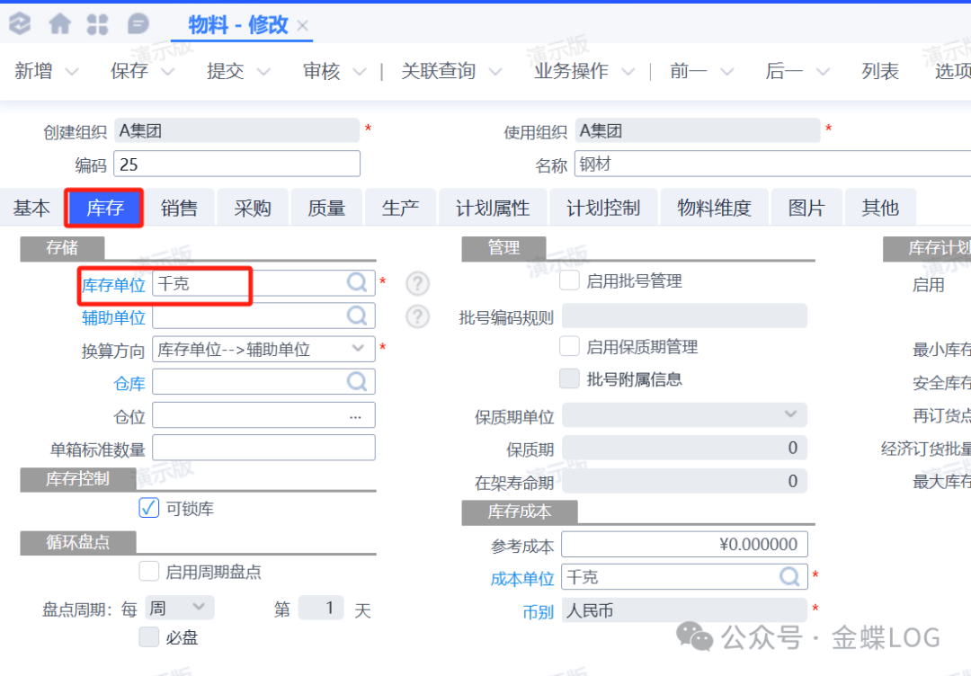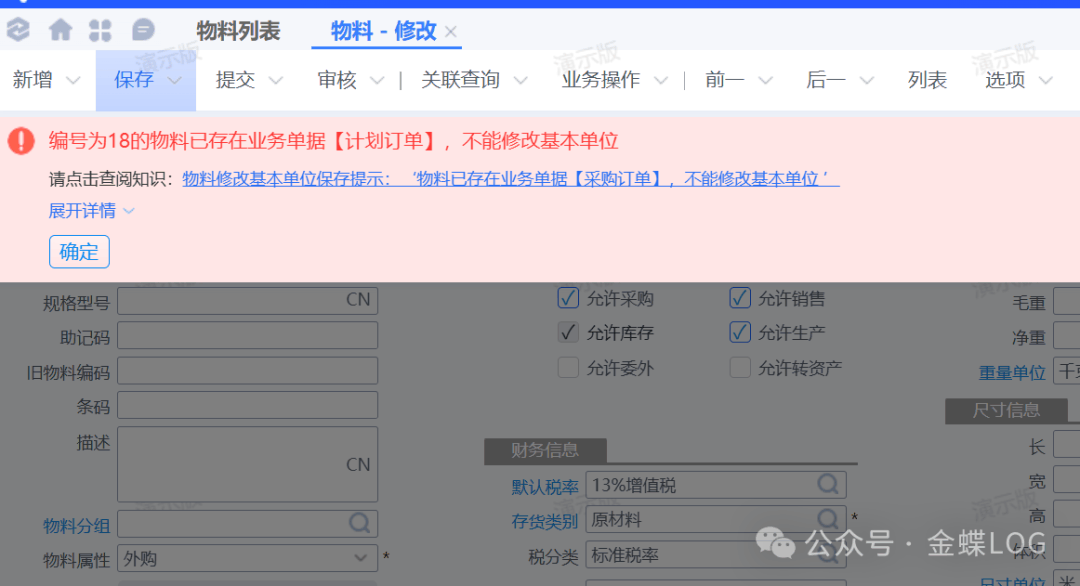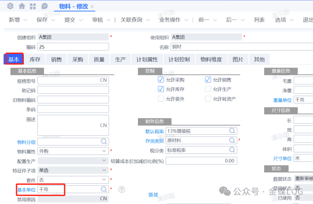 ![]() 在一個計量單位組內(nèi),只有基準計量單位才能被選為基本單位。其他單位則可以作為庫存、銷售、采購等業(yè)務的備用單位,但都必須圍繞基本單位進行換算。 ![]() 三、基本單位一旦確定,后期不可修改這是一個需要特別警惕的規(guī)則: 物料一旦有關聯(lián)單據(jù)之后,基本單位將不允許修改。 ![]()