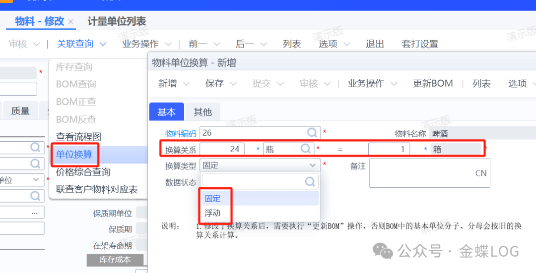 ![]() 當其他頁簽的單位和基本單位不一致,并且不在一個計量單位組時,就需要設置固定的或浮動的換算關系。 例如: