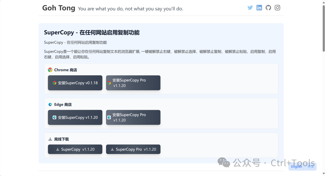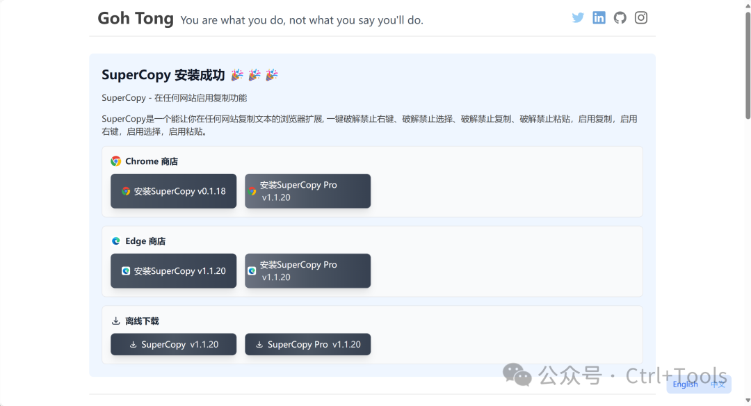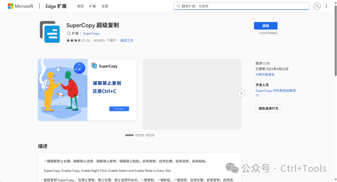 前言很多網(wǎng)站不登錄不允許復(fù)制文章內(nèi)容,讓很多人苦不堪言,先不說登錄步驟麻煩,還有些網(wǎng)站復(fù)制需要購買會(huì)員。下面這款神器,讓你隨心所欲復(fù)制 工具介紹:SuperCopy 超級(jí)復(fù)制今天推薦的實(shí)用工具——SuperCopy 超級(jí)復(fù)制,這是一款瀏覽器插件,支持谷歌瀏覽器、Edge瀏覽器。主要功能是通過破解js、css來達(dá)到一鍵復(fù)制,一鍵粘貼,一鍵選擇,啟用右鍵,啟用復(fù)制,啟用選擇,啟用粘貼! 工具鏈接:https://enablecopy.com/zh_CN/ 本地下載:SuperCopyPro-v1.1.20.zip、SuperCopy-v1.1.20.zip?