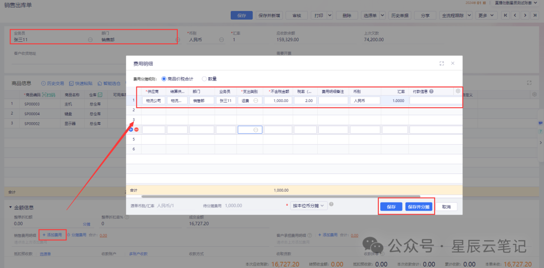 2、本次銷售出庫產(chǎn)生的費(fèi)用,在銷售出庫單的【銷售費(fèi)用】中直接錄入。 點(diǎn)擊【添加費(fèi)用】,選擇對應(yīng)供應(yīng)商、支出類別、金額等。 ①支持一次錄入多種類型費(fèi)用。 ②部門、業(yè)務(wù)員自動帶出銷售出庫單表頭部門、業(yè)務(wù)員。 ③幣別可與銷售出庫單幣別不一致。