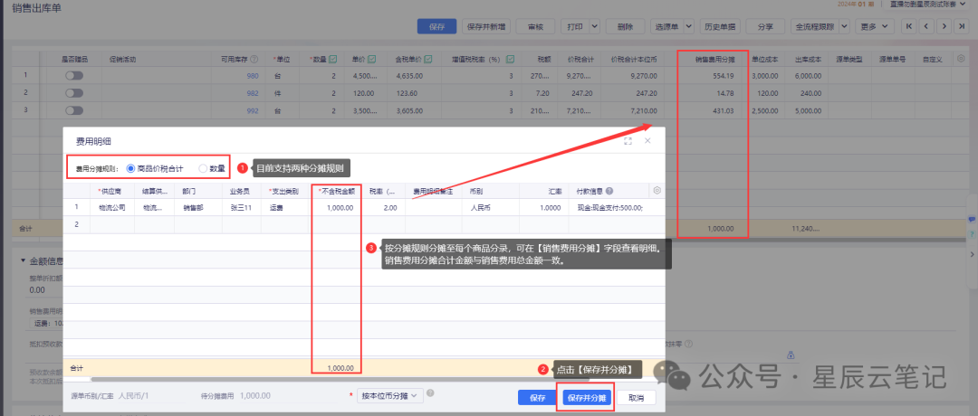 3、銷售費(fèi)用分?jǐn)偂?/span> ①錄入費(fèi)用后,可僅【保存】則僅保存記錄該筆費(fèi)用的支出,不參與銷售出庫單的毛利核算。 ②錄入費(fèi)用后,點(diǎn)擊【保存并分?jǐn)偂?保存記錄該筆費(fèi)用的同時,系統(tǒng)會將費(fèi)用按分?jǐn)傄?guī)則分?jǐn)傊龄N售出庫單,后續(xù)可參與銷售毛利核算。