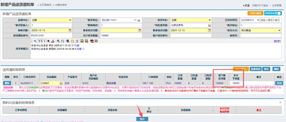 點晴模切ERP銷售部下推發貨通知