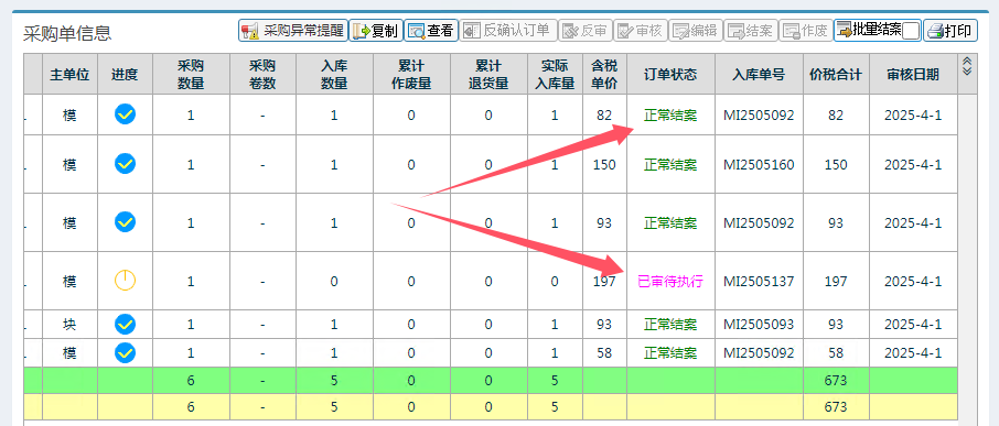 反審核操作步驟:采購管理——采購單管理——采購單明細管理,進入頁面如下圖所示: 注意事項: 如果訂單中有已經結案的明細項目,那么這張訂單是不允許反審駁回的。像下面這張單一共6個物料,只有一個還在“已審待執行”狀態,其余均已結案,那么這張單是不允許反審駁回的,只能將有問題的物料行異常結案關閉,重新下單。 ![]() 另外,查詢時注意查詢條件中的“單據狀態”務必設置為“全部”: ![]() 點晴模切ERP更多信息:https://moqie.clicksun.cn,聯系電話:4001861886 該文章在 2025/9/25 9:53:20 編輯過 |