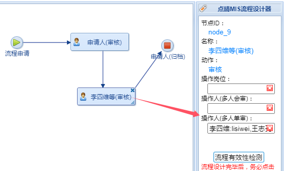 上圖中節(jié)點2必須將審核設(shè)置為審核人,不能是審核崗位,選擇為審核人時,才支持用“Ctrl+鼠標點選”選擇多個審核人。
