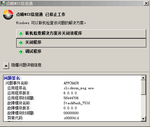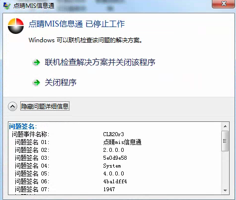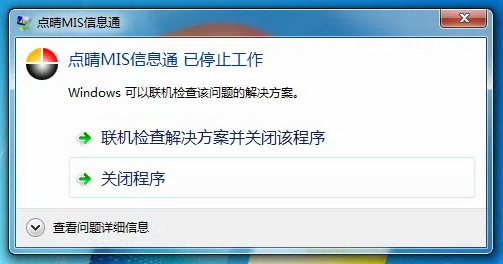 點晴MIS信息通PC客戶端安裝后點擊登錄執行時提示已停止工作,要如何解決?
