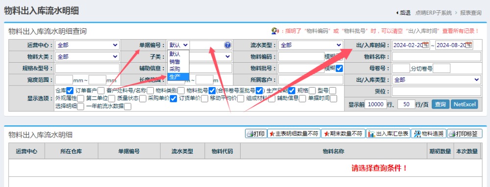 【點晴模切ERP】如何實現以生產工單號查詢到對應的物料使用批次,便于查詢和追溯物料異常的范圍進入倉庫管理-》物料流向管理-》物料出入庫流水明細中(如果看不到此菜單,則應該向管理員申請開放此菜單訪問權限):在物料出入庫流水明細查詢頁面,根據實際需要查詢的單據類型,選擇單據編號中的類型為:銷售/采購/生產,然后輸入銷售單/...