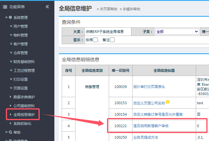 【點晴模切ERP】請問如何設置新增客戶資料審批功能?在點晴ERP系統-》系統管理-》全局信息維護中,找到唯一識別號100221:是否啟用新增客戶審核:如果不需要審核,那么勾選“不啟用客戶審核”,有權限的用戶創建新客戶后,就可以直接生效使用了。如果需要審核,那么勾選“啟用客戶審核”,有權限的用戶創建新客戶后,需要在點晴E...