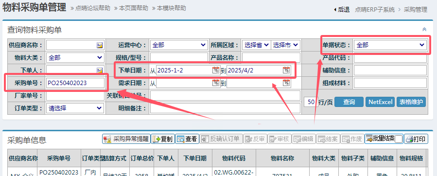 反審核操作步驟:采購管理——采購單管理——采購單明細管理,進入頁面如下圖所示:注意事項:如果訂單中有已經結案的明細項目,那么這張訂單是不允許反審駁回的。像下面這張單一共6個物料,只有一個還在“已審待執行”狀態,其余均已結案,那么這張單是不允許反審駁回的,只能將有問題的物料行異常結案關閉,重新下單。另外,查詢時注意查詢條...