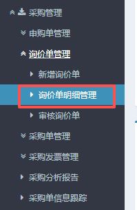 進入ERP系統之后,在左側的功能菜單里找到“采購管理”,點開“詢價單管理”,點擊“詢價單明細管理”。