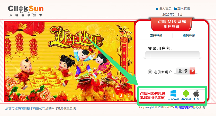 點晴MIS信息通手機APP或PC客戶端下載地址如下:登錄首頁點擊“點晴MIS信息通”或登錄進入點晴MIS系統,點擊右上角手機圖標:出現下載頁面: