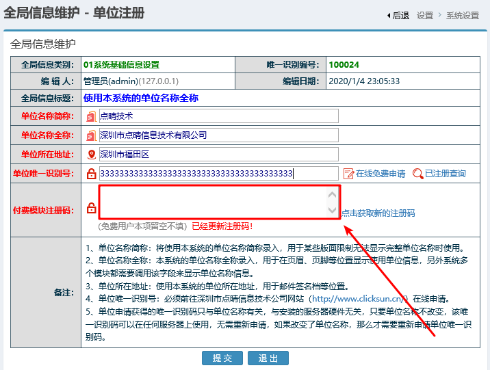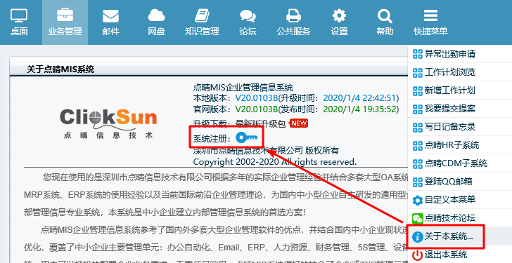 填入專業功能付費注冊碼,將付費后點晴公司提供的付費注冊碼保存到以下位置(點晴OA-》快捷菜單-》關于本系統...-》系統注冊): ![]() ![]() 至此,應該在手機APP或PC客戶端上就應該可以正常訪問了。 特別注意: